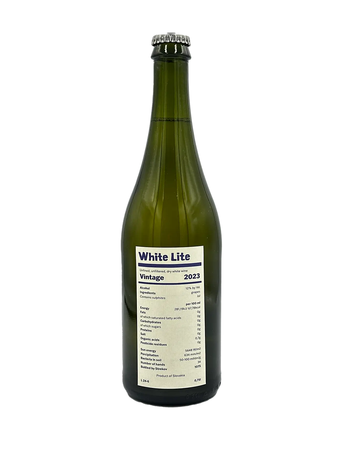 Strekov 1075 White Lite to naturalne, organiczne wino z Welschriesling z Nitra (Słowacja). Lekkie, z żywą kwasowością, nutami cytrusów, mokrego kamienia i soli. Świeże, czyste i flintowe – idealne do lekkiej kuchni i miejskiego relaksu.